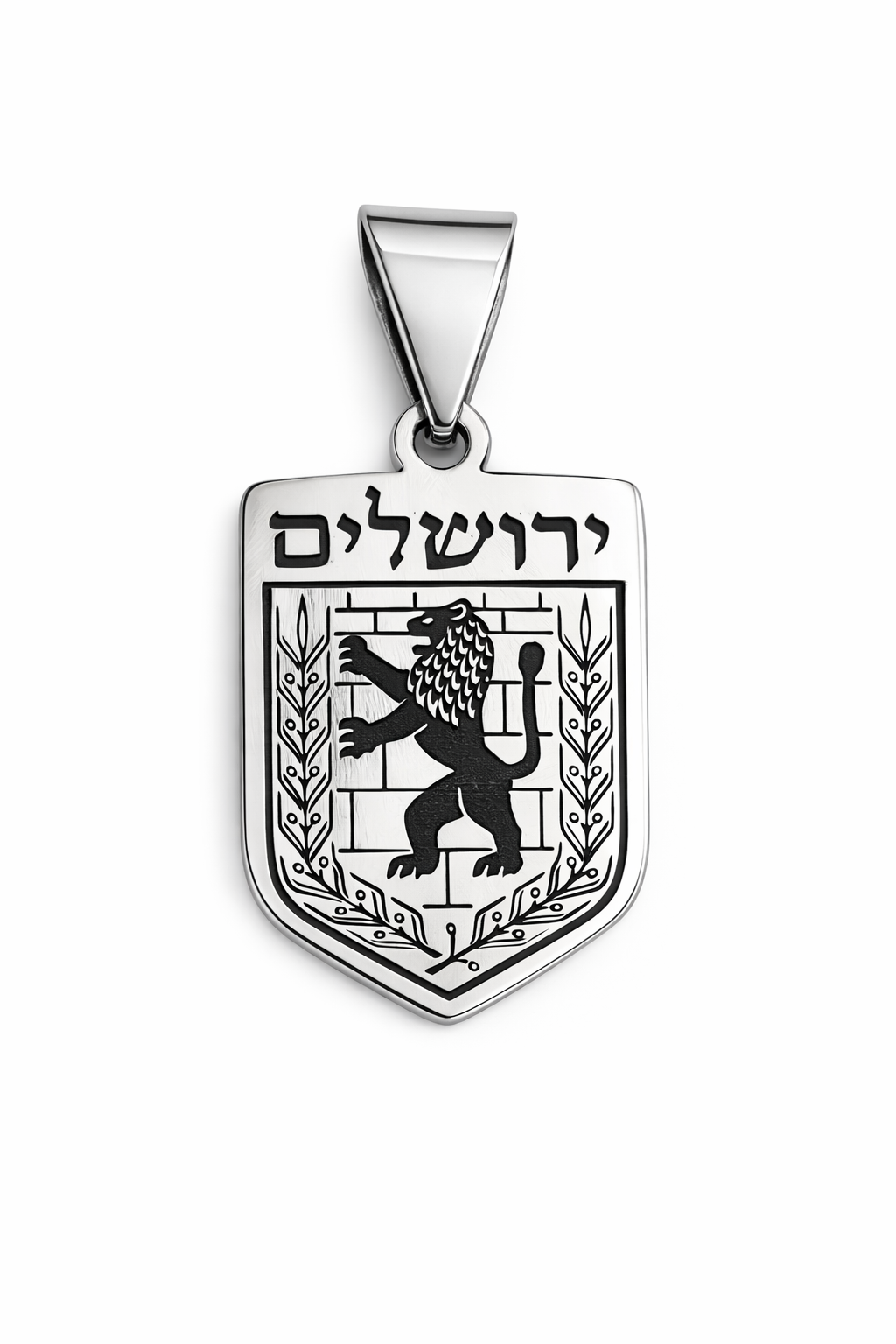 Este pingente em formato de escudo é uma peça marcante e cheia de significado, confeccionada em prata 925 com acabamento artesanal. Seu design detalhado traz a inscrição em hebraico “ירושלים” (Yerushalayim – Jerusalém) na parte superior, acompanhada pelo emblemático leão de Judá ao centro, símbolo de força, proteção e tradição.
